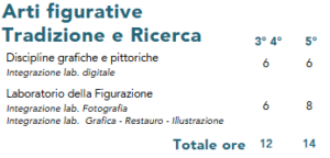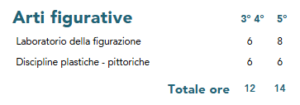 Le 6 ore settimanali delle discipline vengono suddivise i 3 ore di discipline pittoriche e 3 ore di discipline plastiche mentre il laboratorio della figurazione viene suddiviso in 3 ore alla settimana in laboratorio della figurazione pittorico e 3 ore alla settimana di laboratorio della figurazione plastico (classe 3^ e 4^) che diventano 4 + 4 in classe 5^.